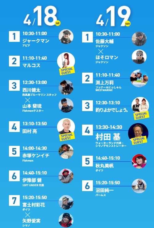 ここでしか手に入らない限定アイテムの即売や、最新タックルの展示が目白押しです。